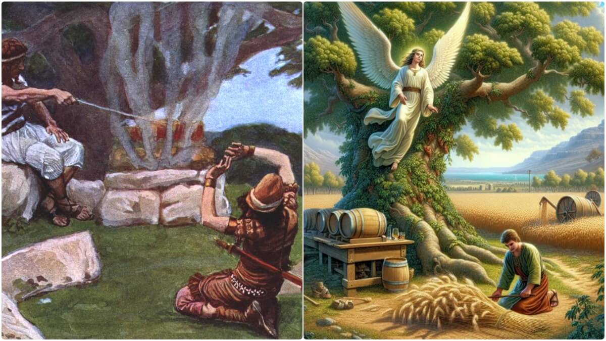 11. Now the angel of the Lord came and sat under the terebinth at Opharah, which belonged to Joash the Abiezrite, while his son Gideon was beating out wheat in the wine press to hide it from the Midianites. 12 And angel of the Lord appeared to him and said to him, "The Lord is with you, O mighty man of valour." 13 And Gideon said to him, "Please, sir, if the Lord is with us, why then has all this happened to us? And where are all his wonderful deeds that our fathers recounted to us. saying, 'Did not the Lord bring us up from Egypt?' But now the Lord has forsaken us and given us into the hand of Midian." 14 And the Lord turned to him and said, "Go in this might of yours and save Israel from the hand of Midian; do not I send you?" 15 And he said to him, "PLease, Lord, how can I save Israel? Behold, my clan is the weakest in Manasseh, and I am the least in my father's house." 16 And the Lord said to him, "But I will be with you, and you shall strike the Midianites as one man." 17 And he said to him, "If now I have found favour in your eyes, then show me a sign that it is you who speak with me. 18 Please do not depart from here until I come to you and bring out my present and set it before you." And he said, "I will stay till you return."