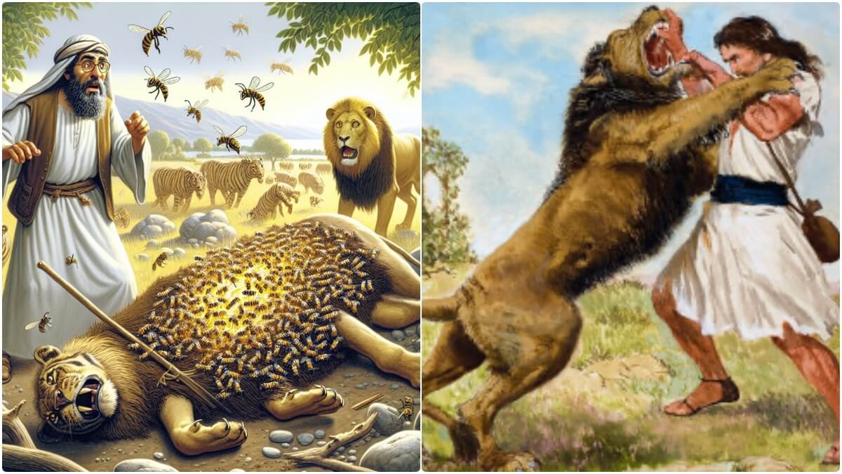 8 After some days he returned to take her. And he truned aside to see the carcass of the lion, and behold, there was a swarm of bees in the body of the lion, and honey. 9 He scraped it out into his hands and went on, eating as he went. AND he came to his father and mother and gave some to them, and they ate. But he did not tell them that he had scraped the honey frotm the carcass of the lion.