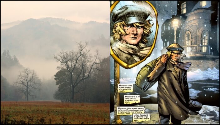 Whenever I find myself growing grim about the mouth; whenever it is a damp, drizzly November in my soul; whenever I find myself involuntarily pausing before coffin warehouses, and bringing up the rear of every funeral I meet; and especially whenever my hypos get such an upper hand of me, that it requires a strong moral principle to prevent me from deliberately stepping into the street, and methodically knocking people's hats off- then, I account it high time to get to sea as soon as I can.