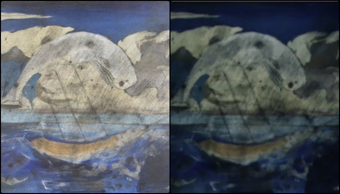 그리고 어딘가 부자연스러운 요소들의 조합처럼 보이는데요. 여기에 부자연스럽다는 것은 마치 따뜻한 아이스아메리카노를 마시는 것 같은 기분이라고 해도 될지 모르겠습니다. 앙상한 건강함이라던가 상춘국과 비슷한 북풍 너머 따뜻한 나라의 겨울 같은 느낌이라던가 전체적으로 부조화에 부자연스럽고 불길한 이 그림에 등장하는 거대한 물고기조차 조악하게 그려졌나 봅니다.
