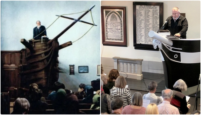 번역이 어려워서 대충 이해하자면, 소설 속 마플 목사는 상당히 명성있는 캐릭터로 교인들의 존경을 받는 인물인가 봅니다. 여기에 이스마엘은 작가의 명성에 대한 비결이 배 위에 선상에서 강의하는 일종의 장치적 효과도 있다고 본 것이 아닐까요? 높은 곳에서 위엄 있는 표정으로 신도들을 내려보며 설교하는 모습은 상상만 해도 그럴듯해 보이니까요. 찾아보니 실제로도 이런 곳에서 설교를 하는 목사가 있나 보네요.