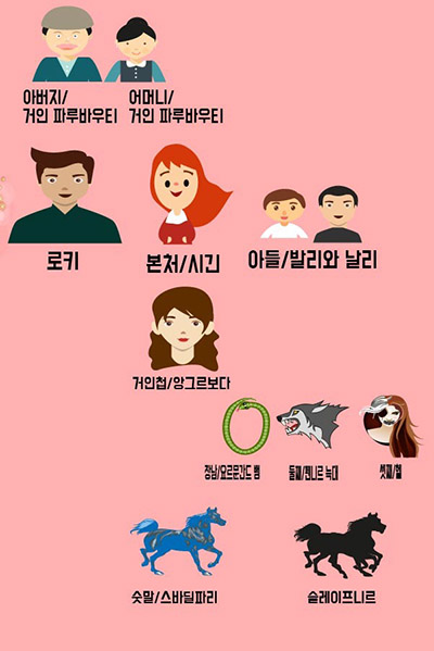 대략 로키의 가계도는 위와 같은데 처복이 있어 외도를 해도 시긴은 일편단심 로키뿐이고 그래서 앙그로보다는 현명한 거인으로 평가받는다. 그러나 오딘은 그녀의 세 괴물 자식들을 뿔뿔이 흩어져 살게 하였으므로 오딘에게 좋은 감정이 있을리가 없다. 오딘은 앙그로보다의 말을 절반만 이해한 채 아내 프리그에게 얘기한다. 그러자 대지의 여신이기도 한 프리그는 지상의 마주치는 모든 것들에게 발데르를 해치지 않겠다는 맹세를 받아낸다. 그것을 신들이 시험하기 위해 온갖 것들을 던지는데 발데르는 죽지 않았다.