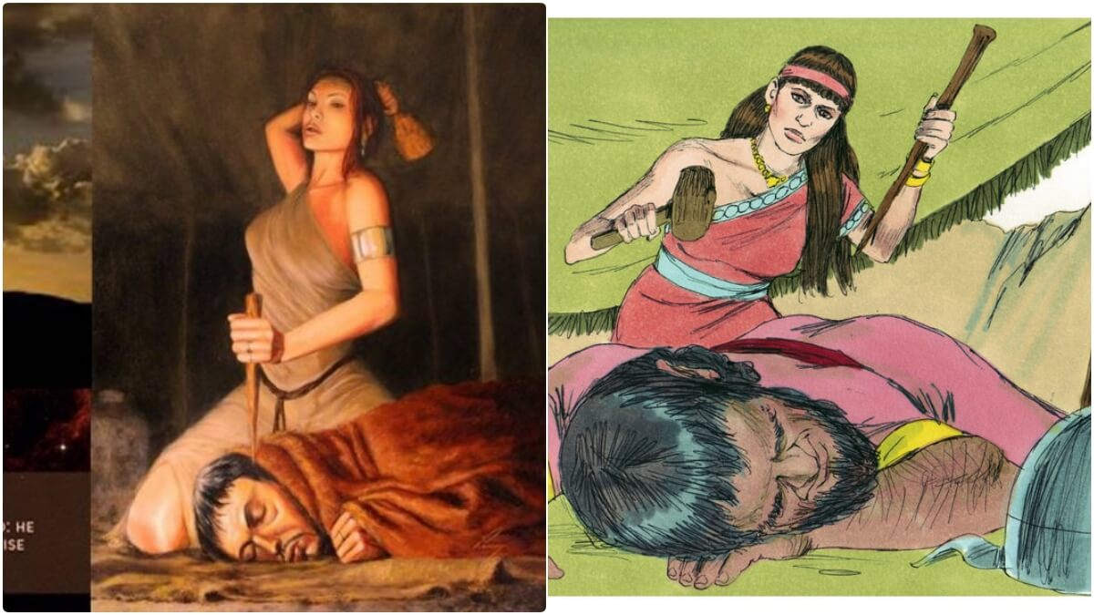 17 But Sisera fled away on foot to the tent of Jael, the wife of HEber the Kenite, for there was peace between Jabin the king of Hazor and the house of Heber the Kenite.18 And Jael came out to meet Sisera and said to him, "Turn aside, my lord; turn aside to me; do not be afraid." So he turned aside to her into the tent, and she covered him with a rug. 19 And he said to her, "Please give me a little water to drink, for I am thirsty." So she opened a skin of milk and gave him a drink and covered him. 20 And he said to her, "Stand at the opening of the tent, and if any man comes and asks you, 'Is anyone here?' say, 'No'." 21 But Jael the wife of Heber took a tent peg, and took a hammer in her hand. Then she went softly to him and drove the peg into his temple until it went down into the ground while he was lying fast asleep from weariness. So he died. 22 And behold, as Barak was pursuing Sisera, Jael went out to meet him and said to him, "Come, and I will show you the man whom you are seeking." So he went in to her tent, and there lay Sisera dead, with the tent peg in his temple.