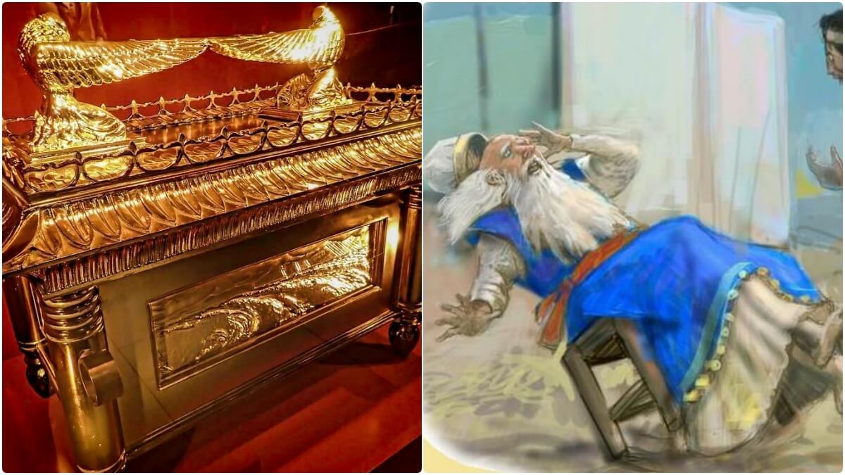 영적 분별력을 상실한 것은 물론 눈과 귀가 어두워서 그냥 산송상 그 자체였습니다. 겨우 궤가 없어졌다는 것을 알아들은 엘리는 충격을 받아 의자에서 넘어져 그대로 목이 부러져서 죽었습니다. 여기서 목이 부러졌다는 것은 수치를 당하거나 심판을 받을 때 자주 등장하는 죽음의 방식이라고는 합니다.