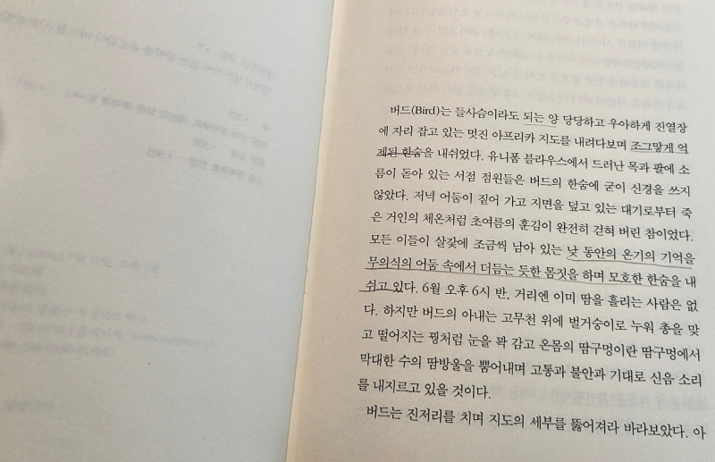 단거리 너러 같은 속도로 늙거 가고 있는 스스로를 바라보았다. 버드, 그는 스물일곱 살 4개월이다... 그가 버드라는 별명으로 불리게 된 것은 열다섯 살 무렵이었다....장식장 유리의 어두운 먹빛을 한 호수에 어설픈 몸짓의 익사체처럼 떠 있는 현재의 그 역시 여전히 새를 닮았다.....버드는 열다섯 살에 이미 바로 이런 얼굴이었다. 스무 살 때도 그랬다. 그는 언제까지 새와 같을까? ...아이들이 줄줄이 딸린 늙어빠진 새......