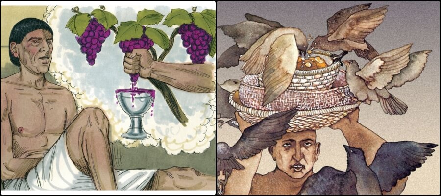 그러자 제빵사도 자기 꿈을 해석해 달라고 합니다. 자신의 머리 위에 케이크 바구니가 세 개 있었는데 맨 위 바구니에는 파라오를 위한 모든 종류의 구운 음식이 있었지만 새들이 자신의 머리 위의 바구니에서 그것을 먹고 있었다고 하였습니다. 그러자 요셉이 해석하기를 바구니 세 개는 사흘을 의미하고 사흘 뒤 파라오가 당신의 머리를 들어 나무에 매달면 새들이 와서 당신의 살을 뜯어 먹을 거라고 하였습니다.