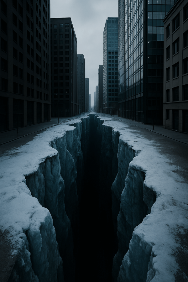 도시 공간에 존재하는 '크레바스'라는 메타포는 매우 독창적이며, 현대인의 소외와 내면의 공허함을 상징적으로 표현합니다. 텍스트만으로도 물리적 현상(싱크홀)과 심리적 상태(우울, 상실감) 사이의 연결이 암시되며, 두 인물이 각기 다른 방식으로 심연을 경험한다는 대비가 효과적입니다. 다만 이러한 주제가 좀 더 명확히 발전되었다면 더 강한 인상을 남겼을 것입니다.