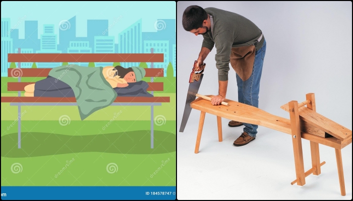 벤치에서 잠을 자기로 결정한 후 주인장이 대충 벤치를 대패로 밀어주기까지 했건만 벤치 길이는 그가 눕기에는 짧았습니다. 그래서 다른 벤치를 가져와 붙였더니 높이가 맞지 않았습니다. 그럼에도 이런 저런 노력 끝에 간이 침대를 만들어 누웠건만 이번에는 창가가 문제였습니다. 창턱 아래에서 회오리 바람을 형성했기 때문입니다.
