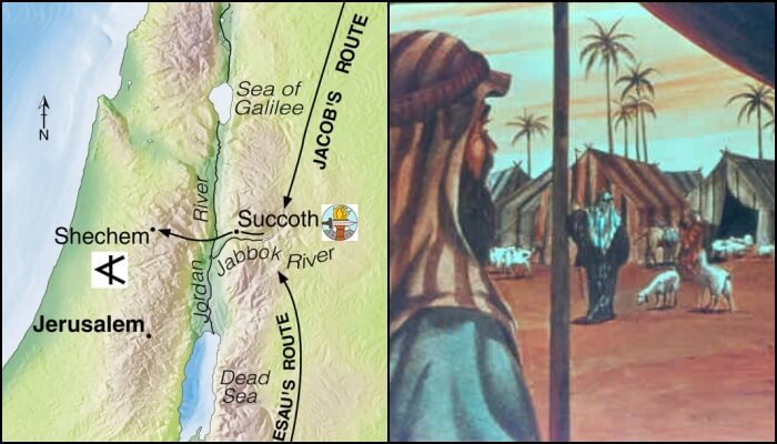 에서는 야곱에게 동행하여 세일로 가자고 하니 야곱은 가축들과 어린 아이들과 같이 가야 한다고 사양하고 에서는 경호할 수 있는 부하들을 두고 먼저 길을 떠납니다. 에서는 가축들이 머물 수 있는 우사 및 가족들을 위한 임시 거주지를 짓고 이름을 수코라고 짓습니다. 장소 의미로 수코는 훗날 임시 거주지를 상징하는 의미로 쓰이게 됩니다. 이후 9월이나 10월에 초막절이라고 하여 광야를 여행하며 임시 거주지를 짓고 축제를 벌이는 초막절 행사가 생겼다고 합니다. 7일 동안 임시 장막을 치고 머물면서 야자나무, 쑥갓, 버드나무 가지를 흔들며 주님 앞에서 기뻐하는 축제를 벌였다고 합니다.