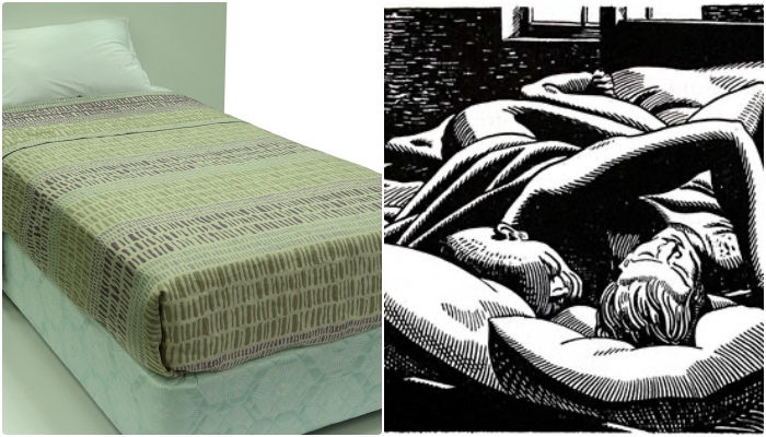 눈을 뜨니 퀴퀘그의 팔이 자신을 덮고 있었고 이스마엘은 마치 그의 다정한 와이프가 된 것 같았겠죠. 그리고 특이한 문양의 침대 커버와 퀴퀘그의 문신은 거의 구분되지 않을 정도였고 팔로 자신을 덮친 그의 팔은 한없이 무거웠고요.