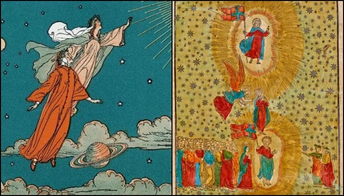 단테의 신곡에 나오는 천국은 아홉 개의 하늘로 구성된다. 그들은 지구를 주축으로 돌고 있다. 하늘에는 9품위의 천사들이 아래로부터 위로 등급에 따라서 좌정해 있다.