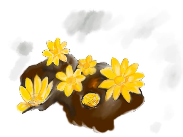 그림을 너무 대충 막 그렸지만 복수초입니다. 이른 봄에 피는 복수초는 많은 이름을 지녔습니다. 황금색 잔처럼 생겨서 측금잔화라고도 하고 설날에 핀다고 원일화라고도 한답니다. 일본에서는 정월초하루에 핀다고 삭일초라고 부르기도 하고요. 눈 속에 핀 연꽃 같다고 해서 설연화라고도 부르고 쌓은 눈 속을 뚫고 나와 꽃이 피면 주변이 동그랗게 녹아 구멍이 난다고 해서 붙여진 눈새기 꽃 혹은 눈색이 꽃이란 이름도 있고요. 얼음새꽃이라고도 부른답니다. 그밖에 빙리화, 정빙화, 빙양화, 조춘화, 복풀 등 무수한 이름이 있습니다.