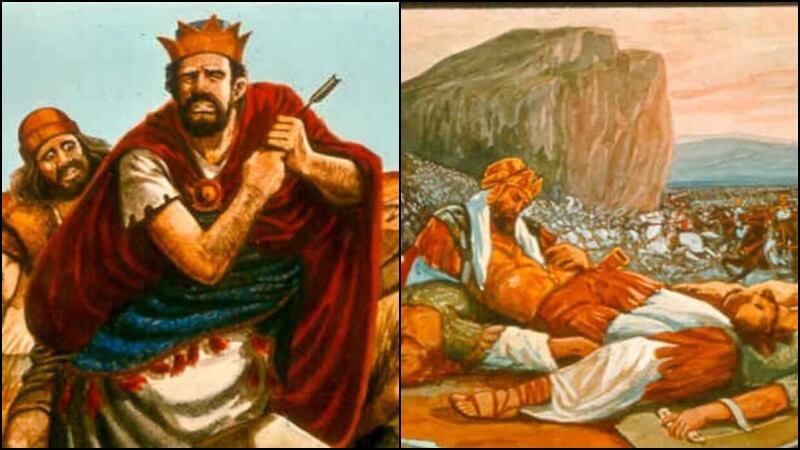 1. Now the Philistines fought against Israle. and the men of Israel fled before the Philistines and fell slain on Mount Gilboa. 2. And the Philistines overtook Saul and his sons, and the Philistines overtook Saul and his sons, and the Philistines struck down Jonathan and Abinadab and Malchi-shua, the sons of Saul. 3 The battle pressed hard against Saul, and the archers found him, and he was badly sounded by the archers. 4. Then Saul said to his armour bearer, "Draw your sword, and thrust me through with it, lest these uncircumcised come and thrust me through, and mistreat me." But his armour bearer would not, for he feared greatly. Therefore Saul took his own sword and fell upon it.