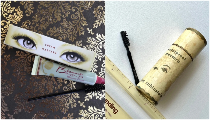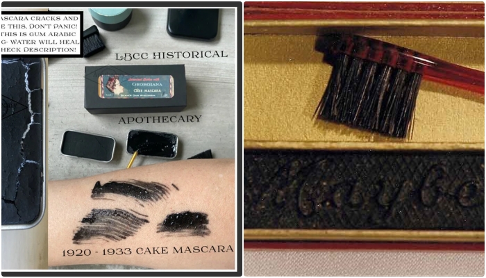 거의 구두약을 바르듯 케이크 타입에 물을 묻혀 브러시로 눈썹에 색을 입혔던 시대의 1920년대 마스카라입니다. 당연히 번지고 뭉치고 그저 까맣게 색을 입히는데만 주력했던 열악한 제품이었습니다. 이와 같은 스타일은 1930년대까지 주를 이루게 됩니다.