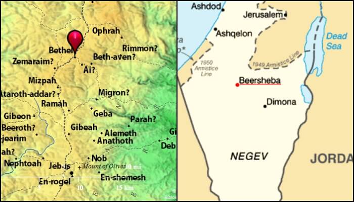 베델은 거룩한 곳을 상징하며 예루살렘 바로 북쪽에 위치한 팔레스타인의 고대 도시입니다. 이곳은 원래 루스라고 불렸고 성경에는 베델로 나옵니다. 8절은 그곳을 중심으로 벧엘 동쪽 산으로 옮겨 텐트를 치니 서쪽은 벧엘이고 동쪽은 에이아이 혹은 아이라 아브라함이 그곳에서 하나님께 제단을 올리고 여호와의 이름을 부르는 내용입니다. 그러면서 점점 니게브 쪽으로 움직였다는 건데요.