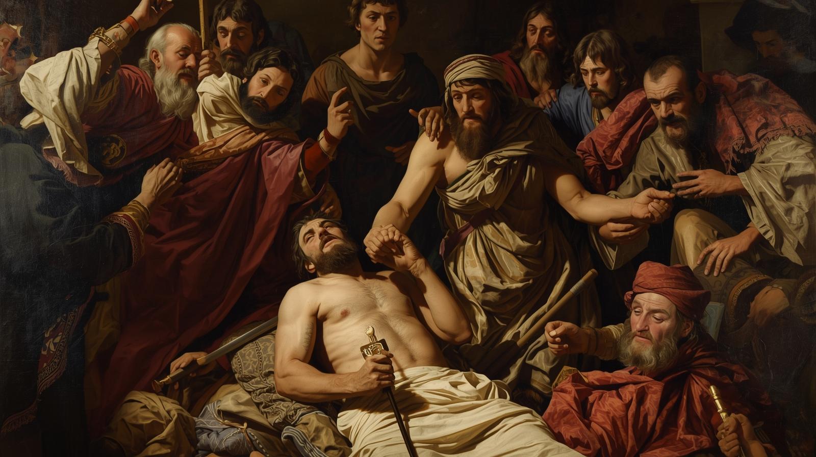 오른손으로는 아마사의 수염을 잡고 입을 맞추려는 제스처를 취한다. 가장 친밀한 인사의 순간, 아마사의 시선이 요압의 오른손과 얼굴에 고정된 틈을 타, 요압은 숨겨둔(혹은 다시 집어 든) 칼로 아마사의 배를 찌른다. 성경은 "창자가 땅에 쏟아졌다(shed out his bowels to the ground)"고 건조하게 기록한다. 두 번 찌를 필요조차 없었다. 이 장면이 더욱 기괴한 것은 그 후의 정적이다. 피 칠갑이 되어 도로 위에서 뒹구는(wallowed in blood) 아마사의 시체를 보며 후발대 병사들은 얼어붙는다. 요압의 부관이 시체를 밭으로 끌어내고 옷으로 덮어버린 뒤에야, 군대는 다시 움직이기 시작했다. 이것은 전쟁이 아니라, 조직 내부의 서열 정리를 위한 조폭적 처형이었다.