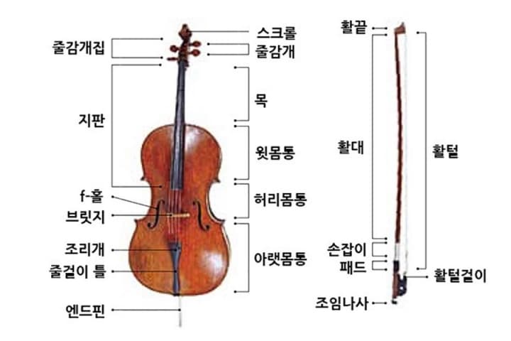 첼로의 해부도는 아래 그림을 참고하면 될 듯합니다.